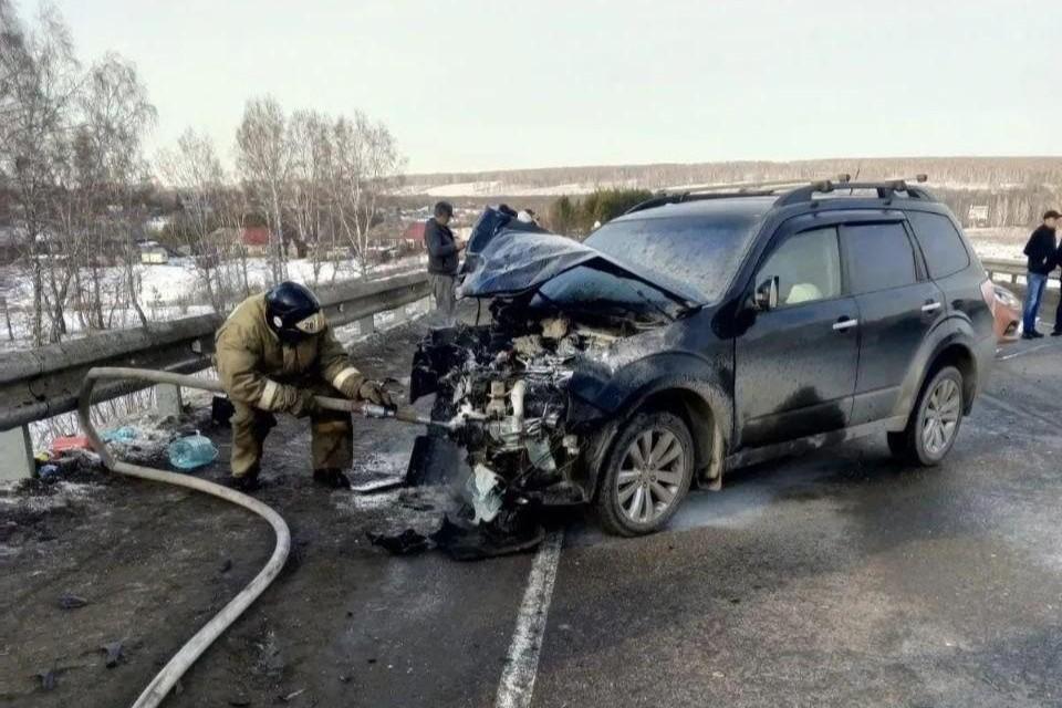 Четверо пострадавших. На Чуйском тракте Subaru налетел на NissanТушить один из автомобилей приезжали пожарные