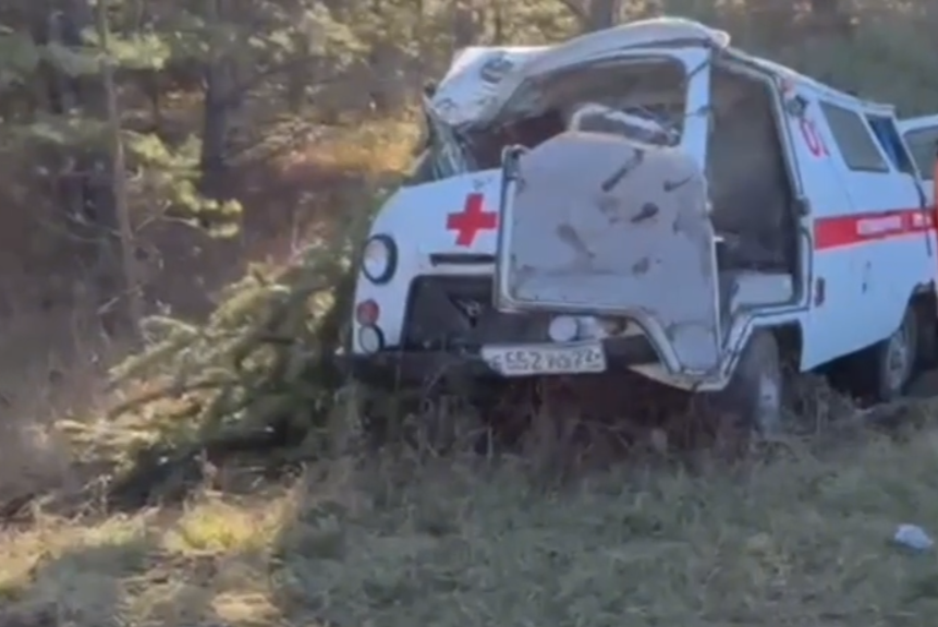 В Алтайском крае скорая слетела с дороги и врезалась в дерево — видеоПострадали два человека