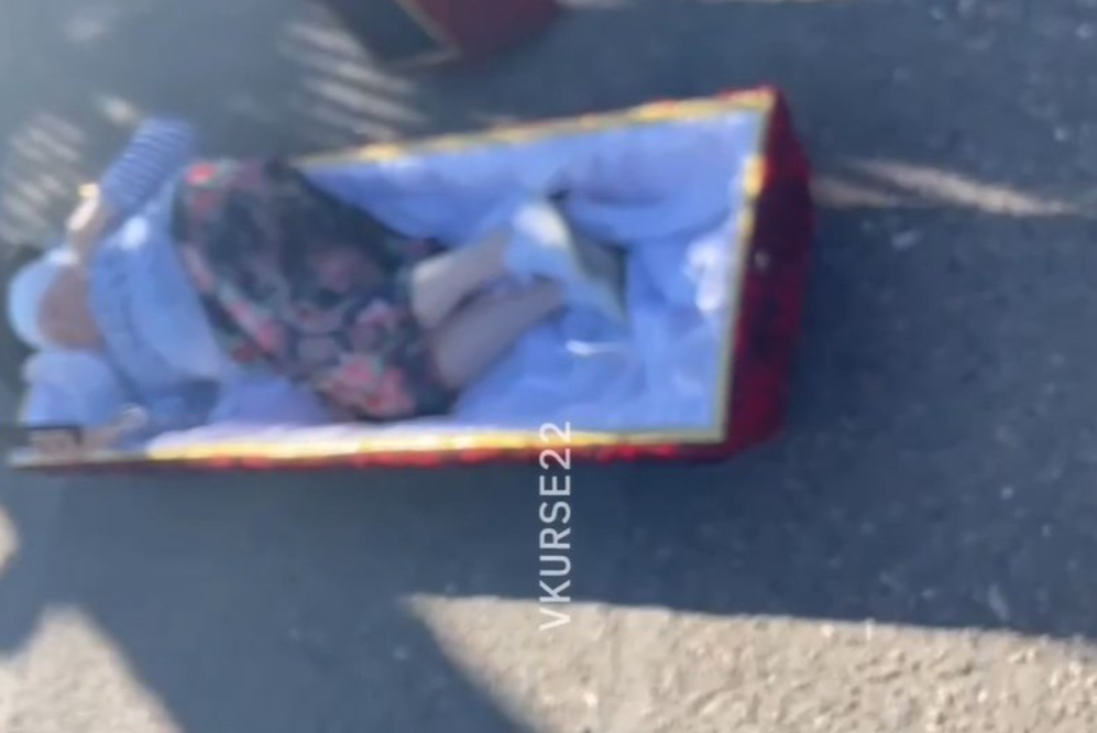 «Ради вечной жизни». В Славгороде женщина легла в гроб посреди улицы и разбила яйца — видеоНа место прибыли сотрудники Росгвардии